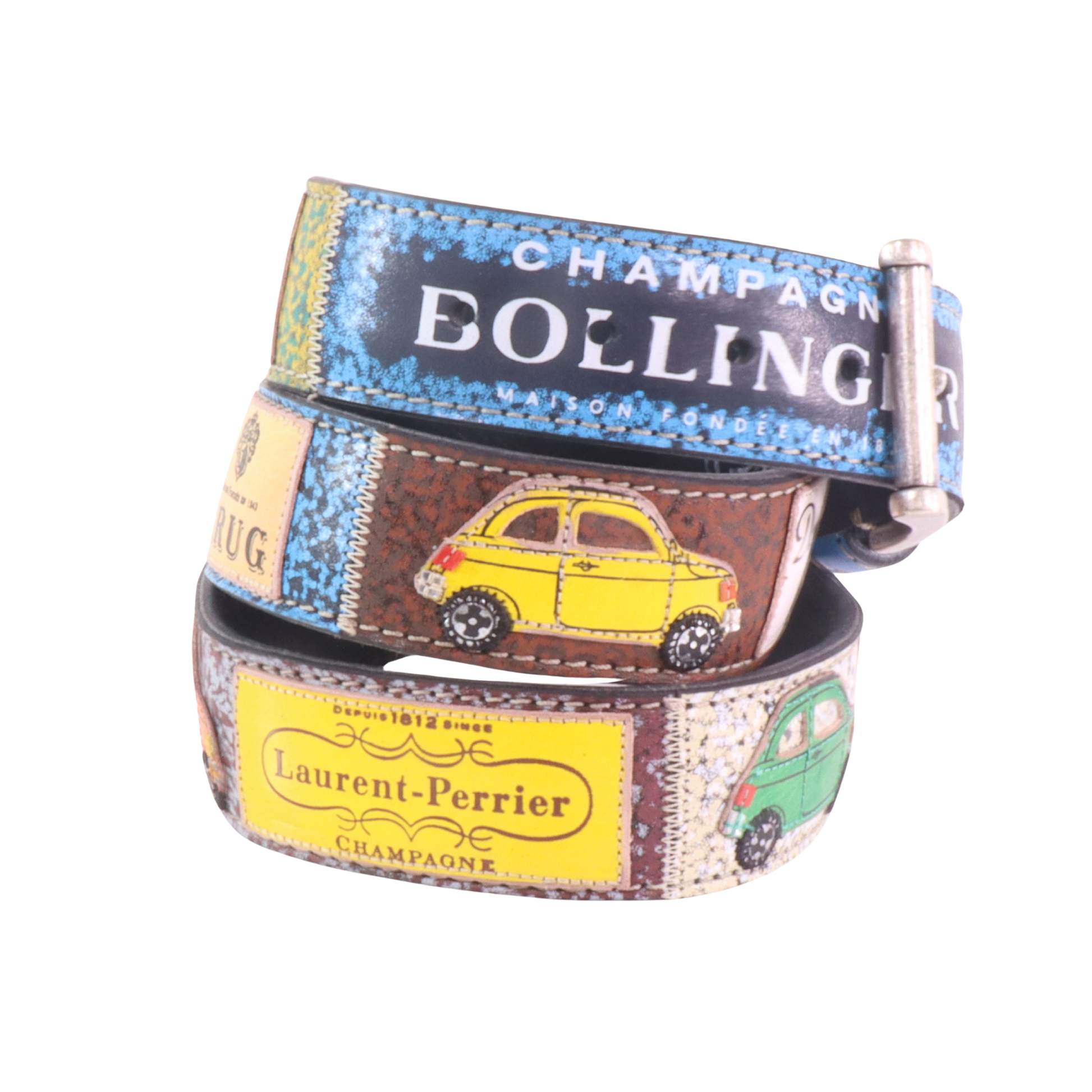 Applicazioni artistiche: sagome ispirate al mondo Fiat 500 e al glamour delle bollicine, ritagliate, dipinte e cucite interamente a mano nel nostro Laboratorio.